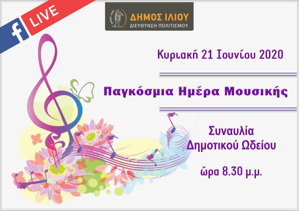 Με μια μελωδική, ζωντανή διαδικτυακή συναυλία, παρέα με τους μαθητές του Δημοτικού Ωδείου, ο Δήμος Ιλίου γιορτάζει και υποδέχεται την Παγκόσμια Ημέρα Μουσικής. Μια ημέρα, κατά την οποία, ερασιτέχνες ή επαγγελματίες καλλιτέχνες παρουσιάζουν ζωντανά τη μουσική τους σε χιλιάδες πολίτες. Την Κυριακή 21 Ιουνίου 2020, στις 8.30 το βράδυ, διασκεδάζουμε με ασφάλεια και υπευθυνότητα, αφήνοντας τη μουσική από τους ήχους μαθητευόμενων μουσικών, να πλημμυρίσει την ψυχή και να αγκαλιάσει τις αισθήσεις μας. Η συναυλία θα μεταδοθεί live από τη σελίδα του Δήμου Ιλίου στο Facebook @DimosIliou