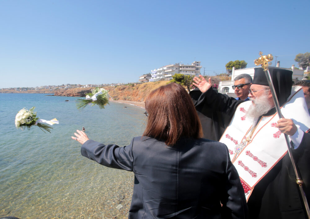 Η Πρόεδρος της Δημοκρατίας Κατερίνα Σακελλαροπούλου και ο Μητροπολίτης Κηφισίας , Αμαρουσίου και Ωρωπού Κυριλλος ρίχνουν λουλούδια στη θάλασσα στο τρισάγιο που έγινε στην Αργυρά Ακτή στην μνήμη των θυμάτων από την πυρκαγιά στο Μάτι, Κυριακή 19 Ιουλίου 2020. Δύο χρόνια συμπληρώνονται σε λίγες μέρες από τη φονική πυρκαγιά που ξεκίνησε από την Καλλιτεχνούπολη και επεκτάθηκε ταχύτατα στο Μάτι και στο Κόκκινο Λιμανάκι με τραγικό απολογισμό τη ζωή 102 ανθρώπων. ΑΠΕ-ΜΠΕ/ΑΠΕ-ΜΠΕ/Παντελής Σαίτας