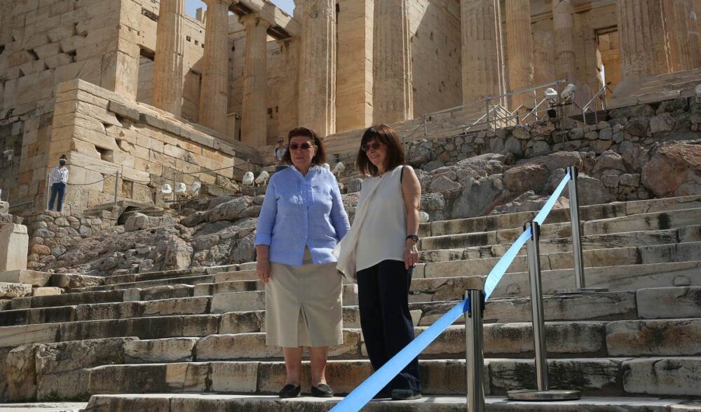 Η Πρόεδρος της Δημοκρατίας Κατερίνα Σακελλαροπούλου (Δ) ξεναγείται από την υπουργό Πολιτισμού και Αθλητισμού Λίνα Μενδώνη (Α) στην Ακρόπολη, Δευτέρα 18 Μαΐου 2020. Ανοίγουν σήμερα, οι αρχαιολογικοί χώροι σε ολόκληρη τη χώρα, στο πλαίσιο της τρίτης φάσης της χαλάρωσης των περιοριστικών μέτρων που είχαν επιβληθεί για τον περιορισμό της εξάπλωσης της πανδημίας. ΑΠΕ-ΜΠΕ/ΑΠΕ-ΜΠΕ/ΟΡΕΣΤΗΣ ΠΑΝΑΓΙΩΤΟΥ